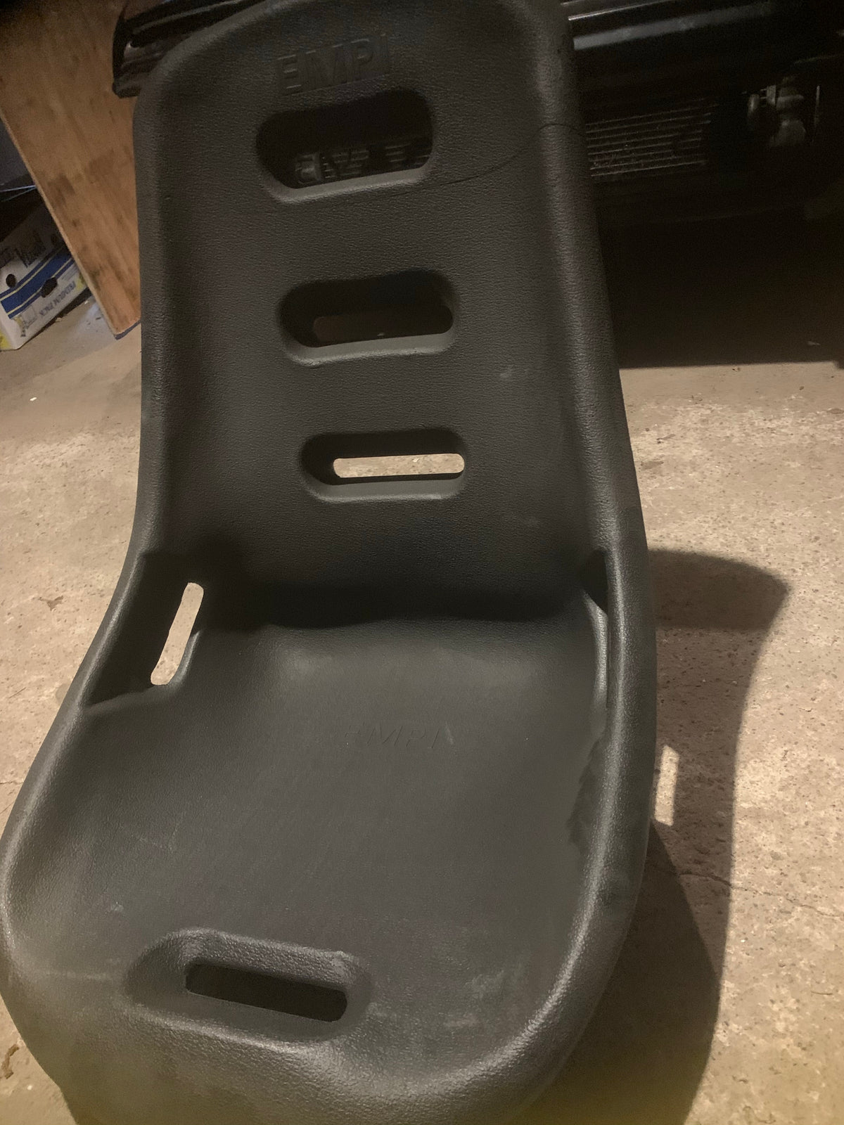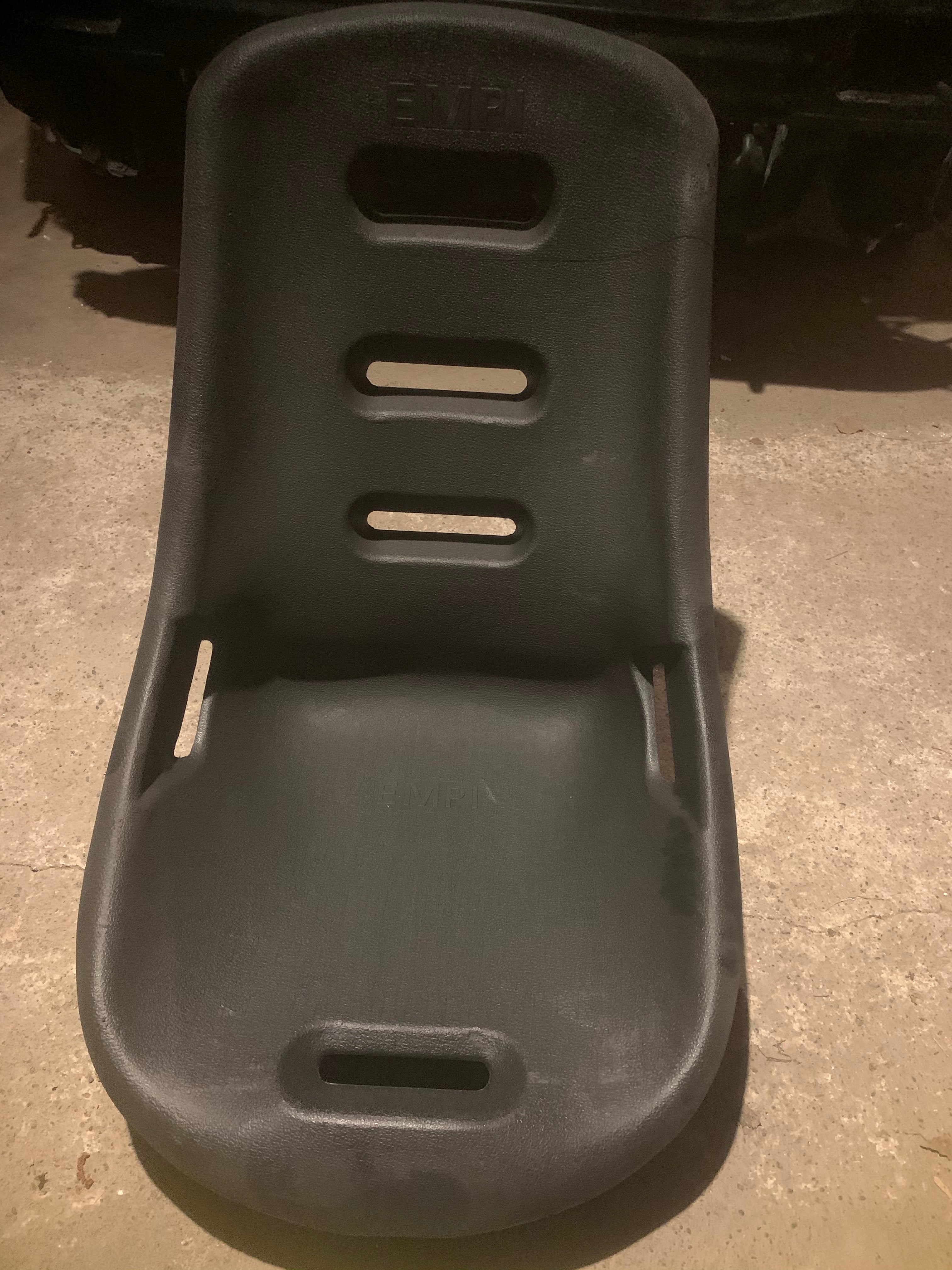 The finish has been upgraded for a great show car look. EMPI seats feature a strong double-wall shell, contemporary design, permanent-mounting inserts molded into the base, slots for seat belts and shoulder straps.