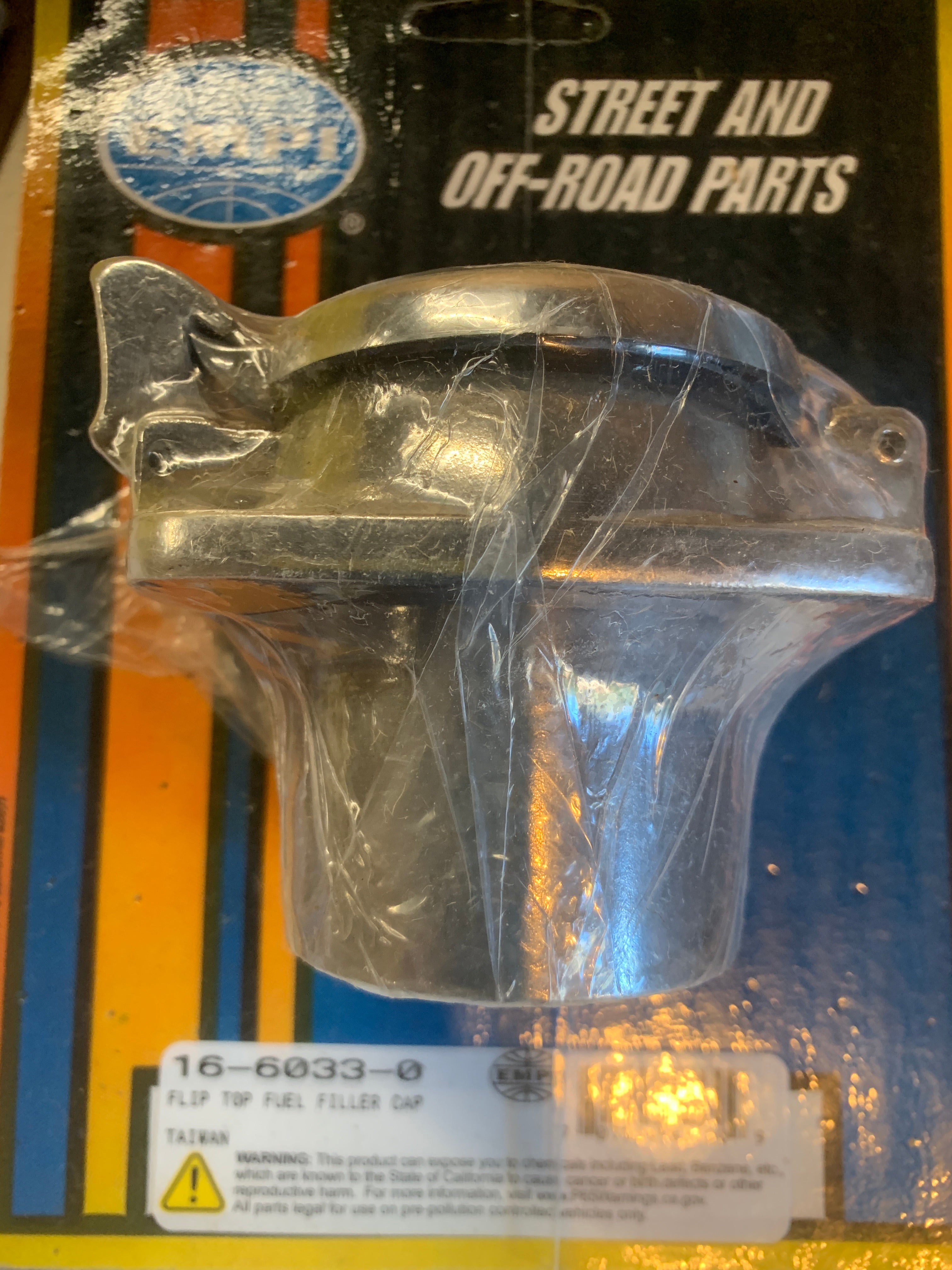EMPI's polished aluminum Fuel Filler Cap features a spring action top with a spring-loaded latch.